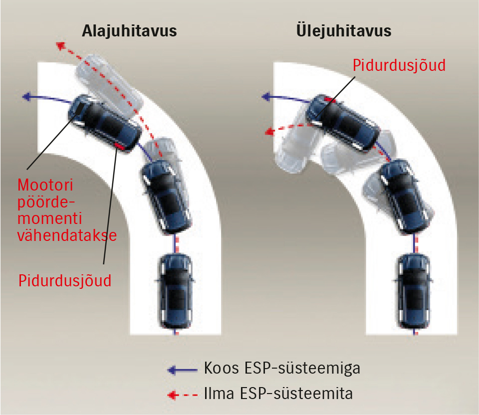Mootori pöördemomendi vähenemise aste, pidurdavad rattad ja nende pidurdusjõud muutuvad olenevalt sõiduoludest. Oma olemuselt on ESP süsteem, mis aitab sõidukit stabiilselt juhtida. Kui libisemine või külglibisemine ületab rehvide ja teepinna vahelise haardumise piire, siis ESP® küll toimib, kuid ei pruugi olla tõhus.